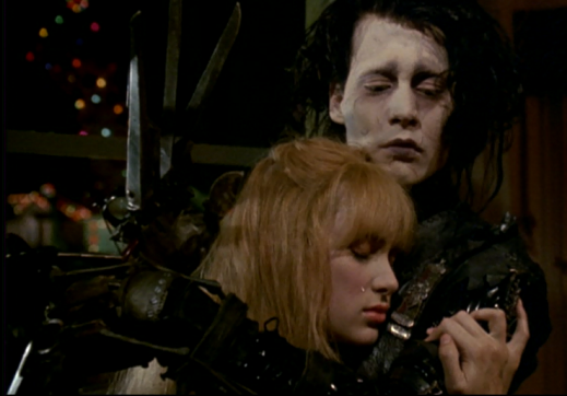 에드워드는 펙의 딸 킴(위노나 라이더)을 보고 첫눈에 반합니다. 킴 역시 에드워드의 순수한 마음에 끌리게 되죠. 하지만 킴의 남자친구 짐의 질투와 마을 사람들의 오해로 인해 에드워드는 도둑, 혹은 위험한 존재로 몰리게 됩니다. 결국 그는 사람들에게 쫓겨 다시 자신의 어두운 성으로 도망칠 수밖에 없게 됩니다.
