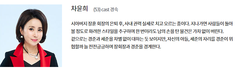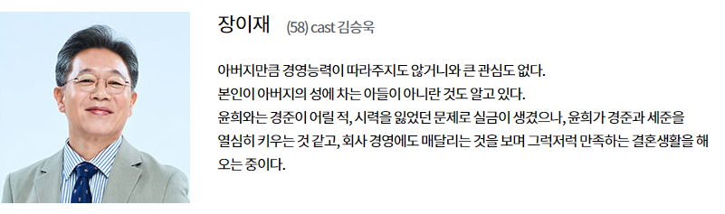 상품기획개발본부 본부장. 이재와 윤희의 아들. 극성인 엄마 윤희의 압박 때문에 스트레스를 많이 받았다. 그 덕분인지 어린 나이임에도 불구하고 본부장으로 승승장구해나가는 세준은 이미 회사에서 소문난 인정받은 인재다. 하지만 5년 전 지은 죄의 죄책감은 여전히 그의 밥맛을 잃게 만들고 수면의 질을 떨어뜨리고 있다.