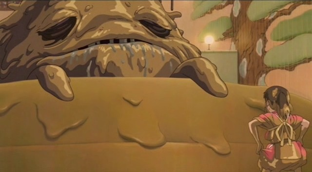 지독한 악취를 풍기며 온천장에 들어온 '오물신'. 모두가 기피하지만 치히로가 묵묵히 그를 씻겨주자, 그의 몸에서 자전거, 가전제품 등 온갖 쓰레기가 쏟아져 나옵니다.